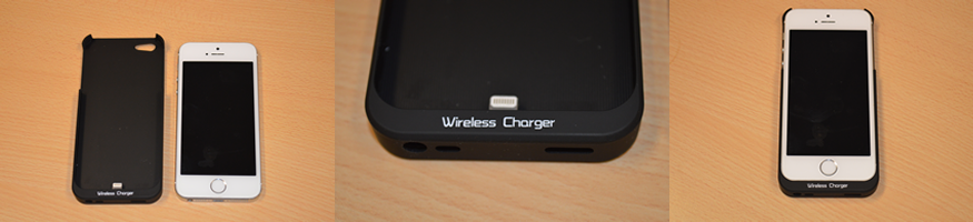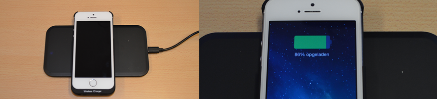 Aangezien de backcover van de iPhone 5 niet te demonteren is hebben we voor deze telefoon een apart hoesje nodig. In dit hoesje zit de draadloze ontvanger ingebouwd. Het plaatsen van de ontvanger is heel eenvoudig, je schuift de iPhone zo in het hoesje. Daarna de oplader aansluiten en de iPhone er op leggen en hij begint direct te laden. Het hoesje ziet er goed uit en dat is natuurlijk een voordeel want we kunnen deze dan gewoon altijd om de iPhone heen laten zitten. De laadtijd is ongeveer het zelfde als bij de eerder gebruikte S3