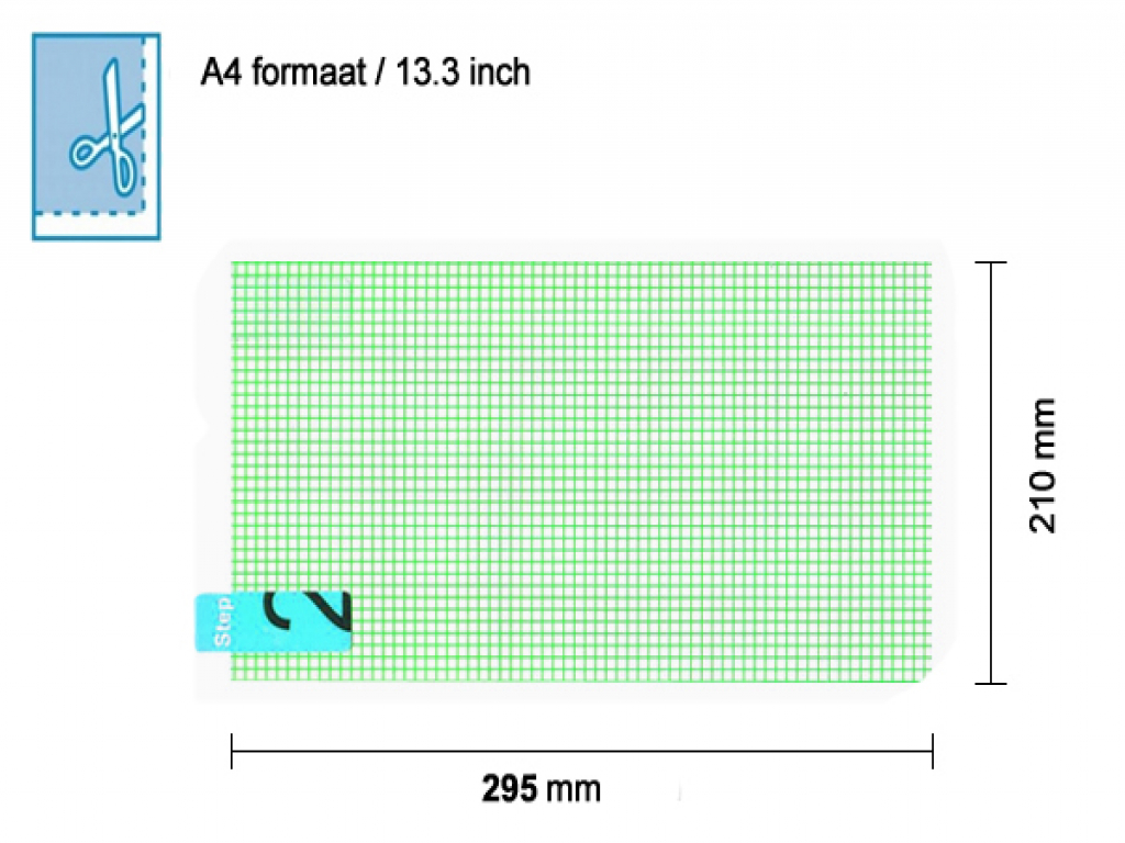 De totale afmetingen van deze universele A4 screenprotector is 295 x 210 mm.