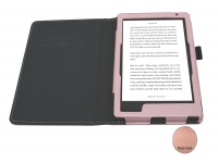 De cover is gemaakt van mooi PVC, dat prettig aanvoelt en er ook mooi uit ziet. Het hoesje is in drie kleuren verkrijgbaar. Ik heb een zwarte. De e-reader zit er veilig en netjes in opgeborgen. De sleepcover zorgt ervoor, dat het scherm goed beveiligd is, en dat je bij het openen weer direct bent waar je gebleven was. Aan/uitknop en oplaadingang blijven goed bereikbaar. Kortom alles wat je van een goede cover verwacht voor een redelijke prijs.