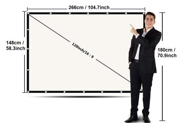 Met afmetingen van 266 x 148 x 0,2 cm is het beamerscherm zo groot dat het indruk maakt, maar niet zo groot dat het onhandig wordt. Toch kun je het beamerscherm erg klein en compact opvouwen, zodat je het simpel overal mee naar toe kunt nemen. Dit scherm is een dikker geweven doek dan de versie van 385 gram, voor nog beter beeld.