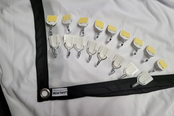 Ook het gewicht is laag, nog geen 0,3 kilo! Zo merk je nauwelijks dat je het bij je draagt. Aangezien dit doek zo geschikt is om overal mee naar toe te nemen, hebben we er ook voor gezorgd dat het makkelijk op te hangen is met maar liefst 16 ophangogen! Gebruik de ringen aan de zijkanten om het doek simpel glad te trekken en waar je maar wilt vast te binden. Met de meegeleverde zelfklevende ophanghaken kun je het ook een vaste plek aan de wand geven en is het scherm er weer makkelijk af te halen. Daarnaast is het scherm ook gemakkelijk met een doekje te reinigen voor het scherpste beeld.