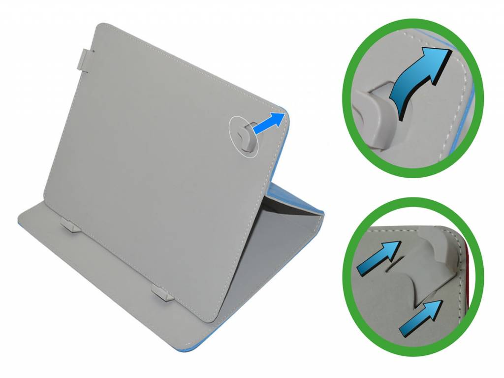 De Prestigio Multipad 4 quantum 7.85 wordt stevig in de case vastgehouden met drie beklede buigbare klemmen (twee onder en 1 links) en één uitschuifbare klem in de rechterbovenhoek die over de hoek van uw toestel valt. Door deze houder ook tegelijkertijd iets op te tillen plaatst u de tablet het gemakkelijkst in de hoes.