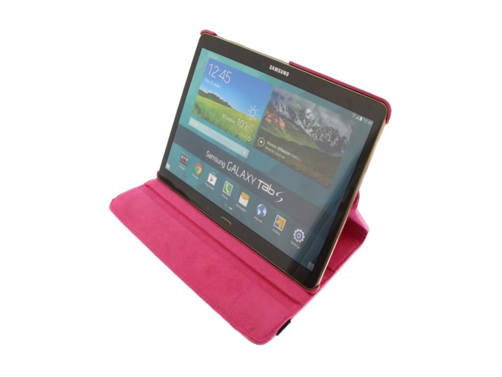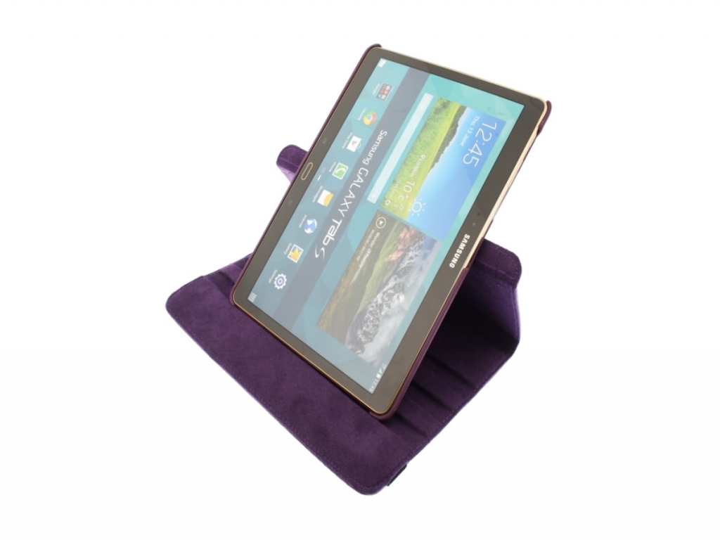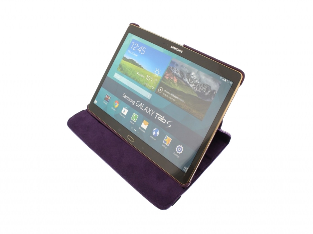 Deze Samsung Galaxy Tab S 10.5 swivel case is voorzien van een ingebouwde standaard met de mogelijkheid om de tablet in meerdere standen te positioneren. De stand is 360 graden roteerbaar. U kunt uw Galaxy Tab S 10.5 dus zowel in een horizontale (landschap modus) als verticale positie (portret modus) neer zetten. Drie diepe groeven geven u de mogelijkheid om te kiezen uit drie kijkhoeken. Zo vindt u altijd de ideale positie voor films, video`s, foto`s, Skype-gesprekken, internetten, etc.