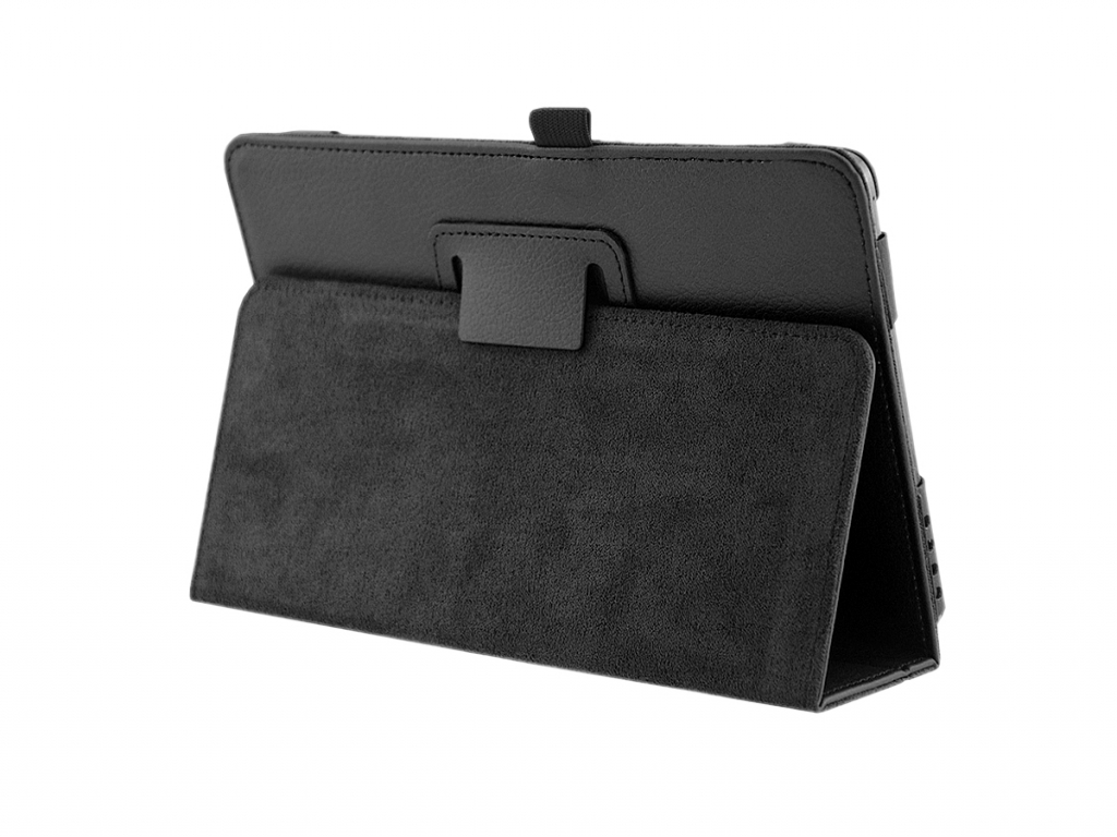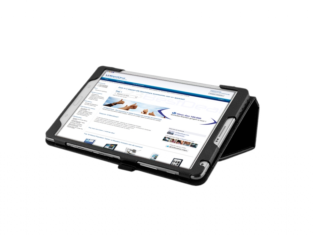 De handige standaard van de book case maakt het mogelijk om uw Samsung tablet op twee manieren neer te zetten. Rechtop in landschapmodus kunt u genieten van films en andere media of om een Skype gesprek te voeren. Schuin liggend in toetsenbordpositie is handig om sneller te typen.