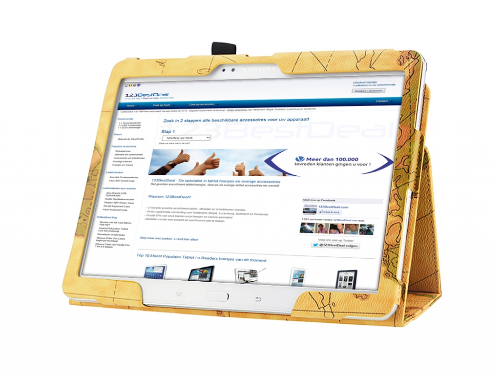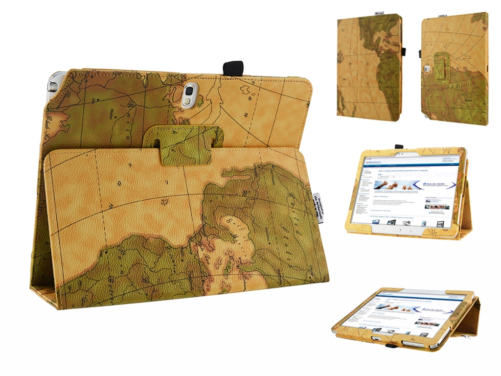 Exclusieve beschermhoes met handige standaard. Deze hoes is een onmisbaar accessoire voor uw Samsung Galaxy tabpro 10.1, als u deze zo lang mogelijk als nieuw wilt houden. De cover is voorzien van een smaakvolle Wereldkaart print in Retro-style.