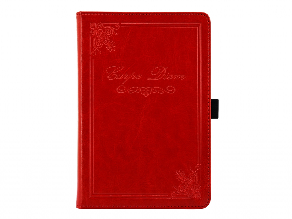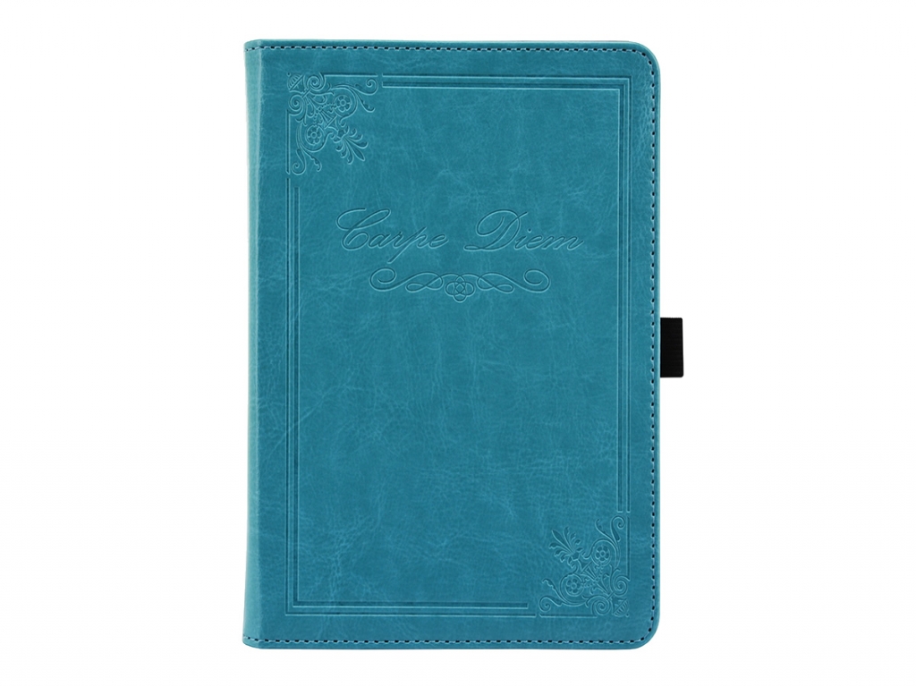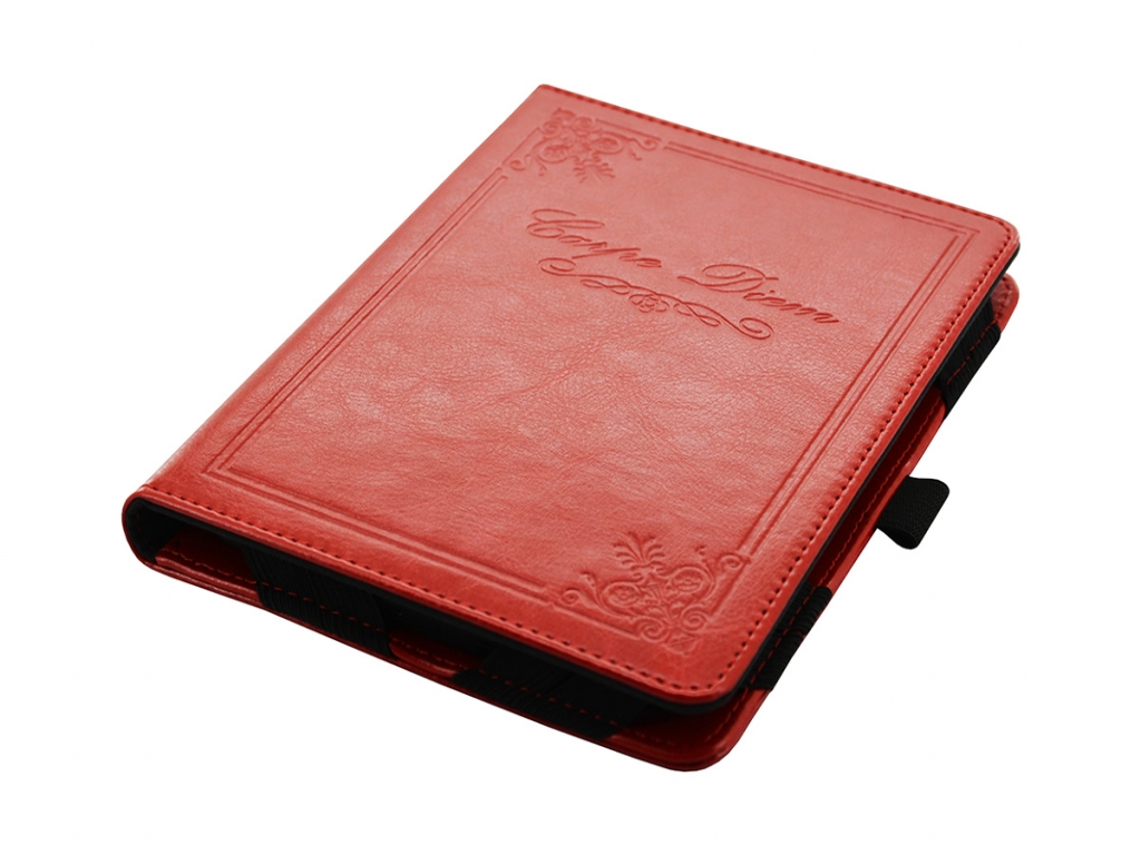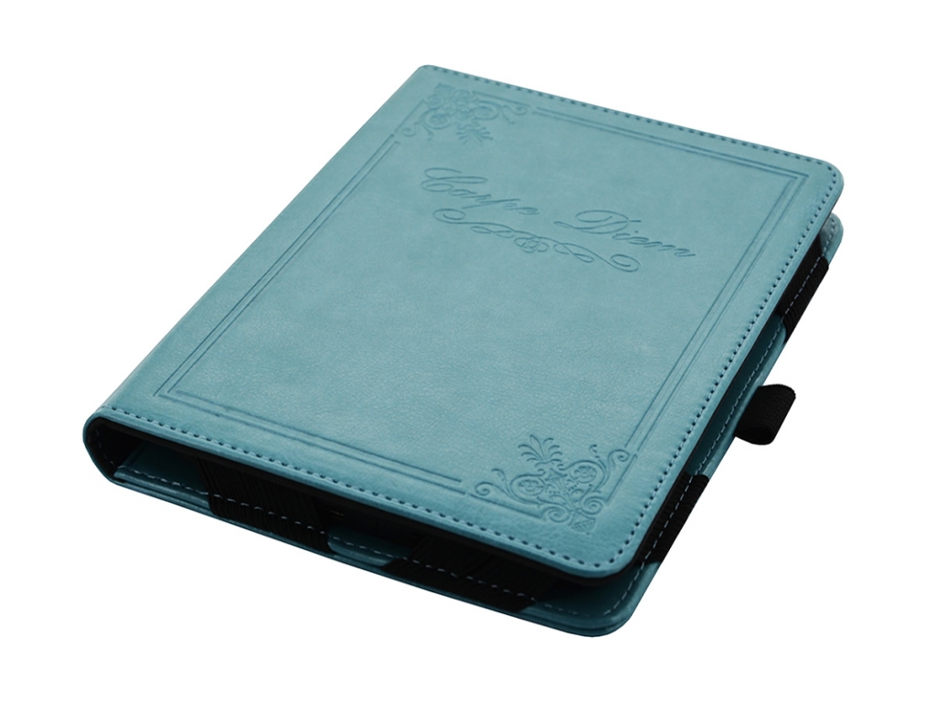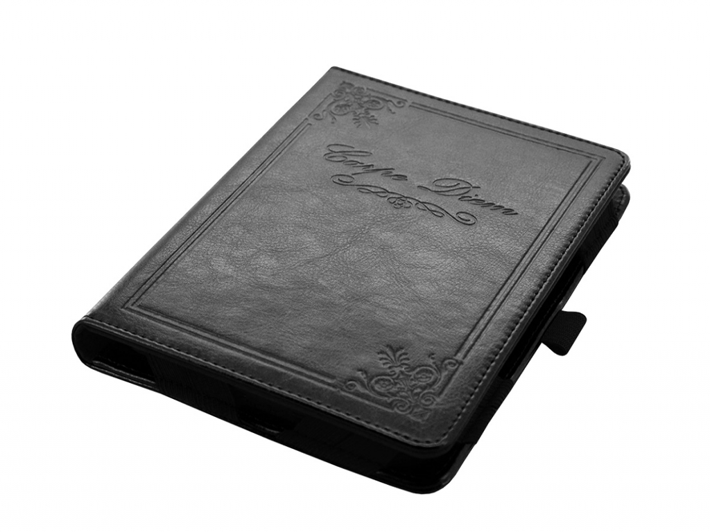De omslag van dit handgemaakte hoesje is vervaardigd van PU leer. U heeft hiervoor de keuze uit meerdere kleuren. De binnenzijde is afgewerkt met een fluweelzachte microvezel voering in een stijlvolle donkergrijze kleur. Aan de voorzijde is een sierlijke vintage `Carpe Diem` opdruk aangebracht, alsook aan de binnenzijde. Stevige magneetjes voorkomen dat de book case snel ongewenst open zal gaan.