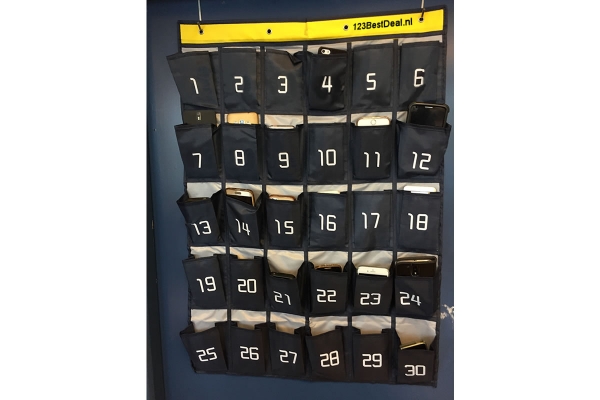 Er zitten 30 vakken met nummers in de telefoontas, zodat de leerling goed kan onthouden in welk vak zijn smartphone veilig opgeborgen is.