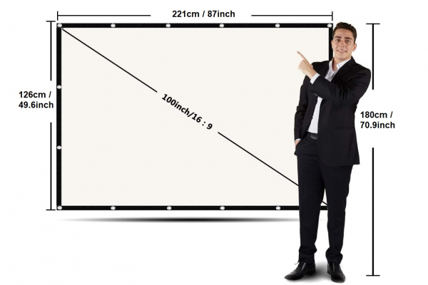 Met afmetingen van 221 x 126 x 0,2 cm is het beamerscherm zo groot dat het indruk maakt, maar niet zo groot dat het onhandig wordt. Toch kun je het beamerscherm erg klein en compact opvouwen, zodat je het simpel overal mee naar toe kunt nemen. Dit scherm is een dikker geweven doek dan de versie van 285 gram, voor nog beter beeld.